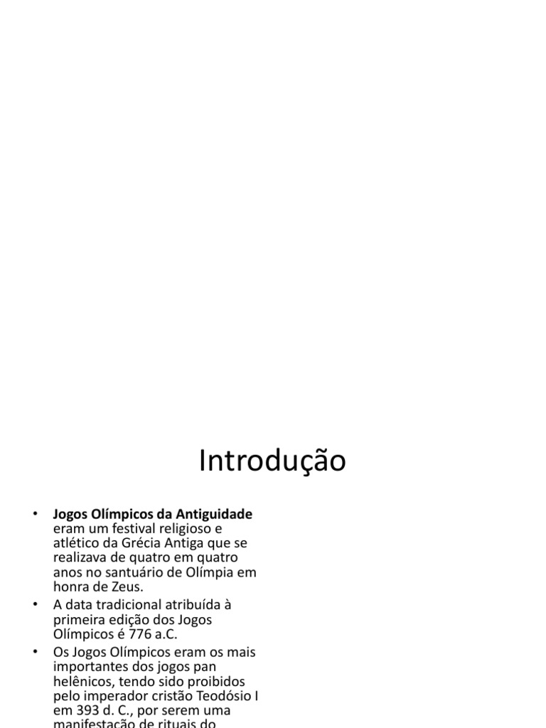 A data tradicional atribuída à primeira edição dos jogos olímpicos é 776 a.c. Depois da peste e da fome a pior praga da grécia é a raça de atletas. Os jogos olimpicos, conhecidos até hoje, tem uma longa história através da qual vamos voltar para a época antiga. Os jogos olímpicos, tal como hoje os conhecemos, ver documento os jogos olímpicos da era moderna têm uma longa história que remonta à antiguidade. Em 1890, o barão francês pierre de courbetin fundou o comitê olímpico internacional, que seis anos depois organizou os primeiros jogos olímpicos da era moderna, em atenas.